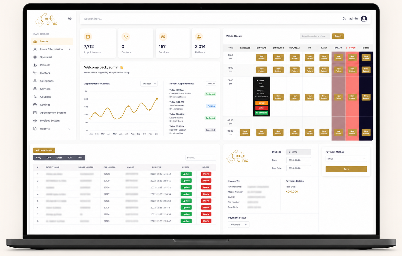 تطبيق ويب مخصص تم تطويره لصالح Carole Clinic في الكويت لإدارة خدمات وعمليات العيادة بكفاءة.
